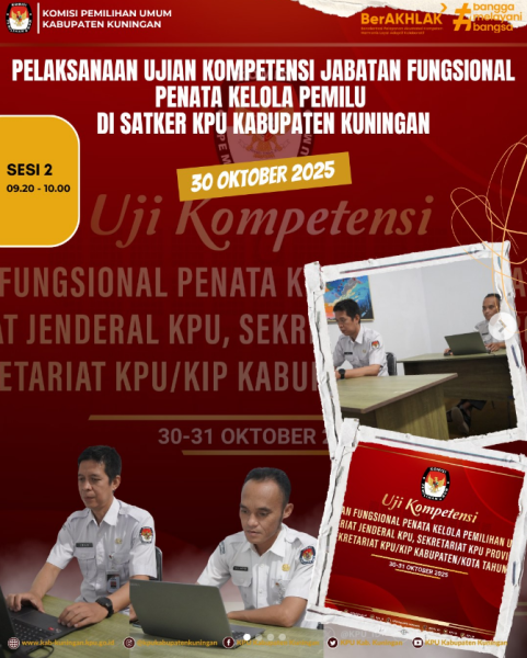 #TemanPemilih, Sekretariat KPU Kabupaten Kuningan telah mengikuti Ujian Kompetensi Jabatan Fungsional Penata Kelola Pemilihan Umum Ahli Pertama sesuai dengan Surat Undangan Setjen KPU RI Nomor : 1700/SDM.09-Und/04/2025. Kegiatan ini bertujuan untuk pembinaan karir serta pemenuhan peta jabatan bagi Jabatan Fungsional Penata Kelola Pemilihan Umum di Lingkungan KPU, KPU Provinsi, dan KPU Kabupaten/Kota. Satker KPU Kabupaten Kuningan mengikutkan tiga (3) orang staf yaitu : Toto Saptori, Iwan Hermawan dan Rinawati untuk mengikuti ujian kompetensi tersebut pada Hari Kamis (30/10/2025). . . #KPUMelayani ....