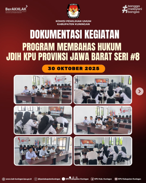 #TemanPemilih, KPU Kabupaten Kuningan telah mengikuti Kegiatan Program Membahas Hukum (MH) Jaringan Dokumentasi dan Informasi Hukum (JDIH) KPU Provinsi Jawa Barat seri #8 via zoom meeting dengan KPU Kabupaten/Kota se Jawa Barat. Kegiatan tersebut diikuti oleh Kadiv Hukum Pengawasan Bapak Aan Nasrudin, Kasubbag Teknis dan Hukum Bapak Oban Sarbini dan Para Staf CPNS Sekretariat KPU Kabupaten Kuningan bertempat di Ruang Aula KPU Kabupaten Kuningan pada Hari Kamis, (30/10/2025). Kegiatan tersebut membahas Topik Pelaporan dan Pengecekan Media Sosial JDIH KPU Provinsi dan KPU Kabupaten/Kota se Jawa Barat Tahun 2025. . . #KPUMelayani ....