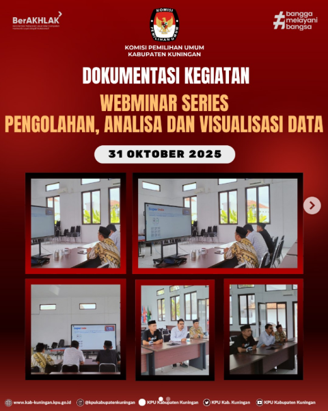 #TemanPemilih, KPU Kabupaten Kuningan mengikuti Webminar series Pengolahan, Analisa dan Visualisasi Data pada di Aula KPU Kabupaten Kuningan, hari Jum'at (31/10/2025). Kegiatan ini merupakan undangan dari KPU RI kepada KPU Provinsi dan KPU Kabupaten/Kota guna sebagai sarana berbagi pengetahuan, pengalaman dan praktik terbaik mengenai pemanfaatan teknologi digital dalam berbagai aspek kelembagaan baik yang berkenaan langsung dengan penyelenggaraan pemilu maupun kegiatan pendukung lainnya. Kegiatan tersebut diikuti oleh Ketua dan Anggota KPU Kabupaten Kuningan. . . #KPUMelayani ....