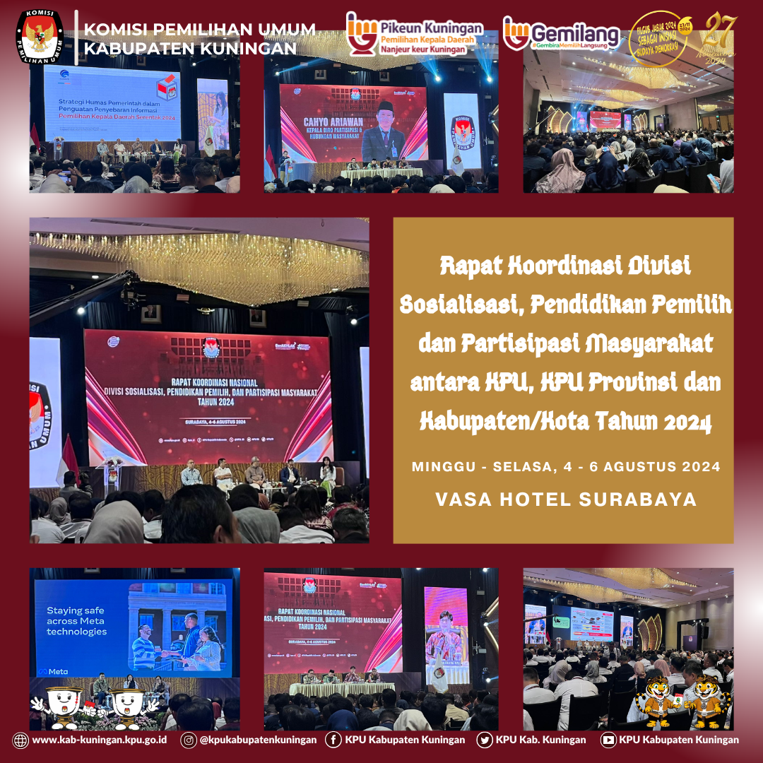 #PemilihGemilang, KPU Kabupaten Kuningan Mengikuti Undangan Rapat Koordinasi Divisi Sosialisasi, Pendidikan Pemilih dan Partisipasi Masyarakat Antara KPU, KPU Provinsi dan KPU Kabupaten/Kota Tahun 2024. Kegiatan Tersebut dilaksanakan di Vasa Hotel Surabaya pada Hari Minggu sampai dengan Selasa, 4 - 6 Agustus 2024. KPU Kabupaten Kuningan dihadiri langsung oleh Kadiv. Sosdiklih dan Parmas dan Kasubbag SDM Sosdiklih dan Parmas.