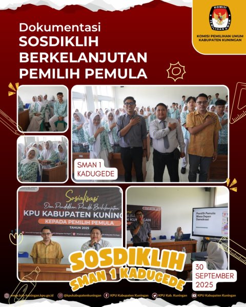 #TemanPemilih, KPU Kabupaten Kuningan telah melaksanakan Sosialisasi Pendidikan Pemilih Berkelanjutan dengan segmen Pemilih Pemula di SMAN 1 Kadugede Kabupaten Kuningan pada Hari Selasa, 30 September 2025. Kegiatan tersebut bertujuan untuk memberikan edukasi dan pemahaman mengenai pentingnya berpolitik sejak dini kepada tunas-tunas bangsa untuk dapat mengaplikasikan berdemokrasi dikehidupan sehari-hari. Materi yang diberikan adalah tata cara menjadi pemilih dan memilih yang baik dan sah. Dalam kegiatan tersebut dihadiri oleh Kadiv Sosdiklih Parmas dan SDM KPU Kabupaten Kuningan Bapak Aof Ahmad Musyafa, Kasubbag Sosdiklih Parmas dan SDM Bapak Erik Hamdani, Staf Parmas Sekretariat KPU Kabupaten Kuningan, Kepala Sekolah SMAN 1 Kadugede Bapak Ridha Jaya Buana, Guru PPKN SMAN 1 Kadugede Bapak Aldy Sampurna dan Siswa Siswi Kelas XII SMAN 1 Kadugede. Acara diawali oleh sambutan dari Kadiv Sosdiklih Parmas Bapak Aof dan dilanjutkan oleh Kepala Sekolah SMAN 1 Kadugede Bapak Ridha dan acara inti yaitu penyampaian materi oleh Bapak Aldy mengenai menjadi Pemilih dan Memilih yang baik dan sah. Acara tersebut disambut antusias oleh Siswa Siswi SMAN 1 Kadugede hingga akhir acara dengan banyaknya pertanyaan yang diajukan. . . #KPUMelayani