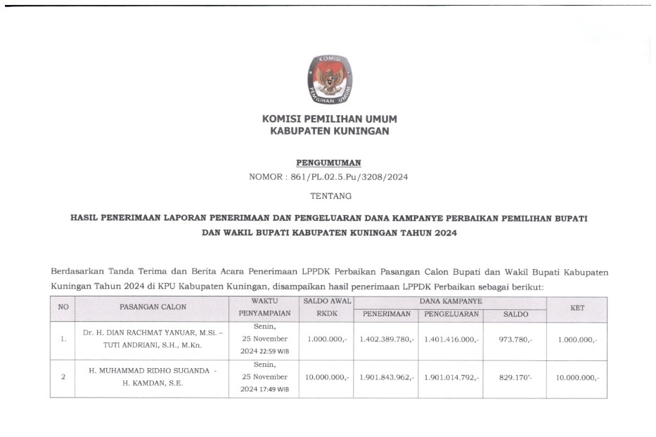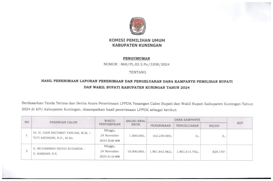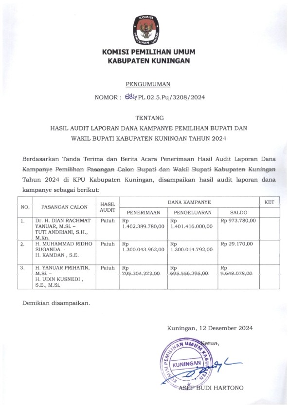 Berikut kami sampaikan Pengumuman Hasil Audit Laporan Dana Kampanye Pemilihan Bupati dan Wakil Bupati Kuningan Tahun 2024.
