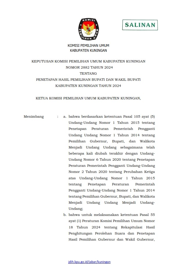 Berikut kami informasikan Penetapan Hasil Pemilihan Bupati dan Wakil Bupati Kuningan Tahun 2024