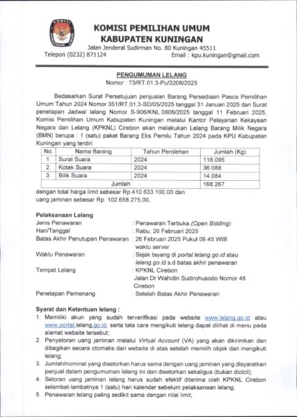 Berikut kami sampaikan informasi perihal Pengumuman Lelang Barang Persediaan Pasca Pemilihan Umum Tahun 2024.