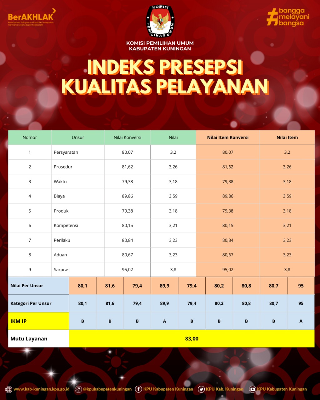 Pelayanan Publik Terpadu Komisi Pemilihan Umum Kabupaten Kuningan Periode Januari - Juni 2025 sehingga memperoleh penilaian IKM 83,00 (B) atau Baik.