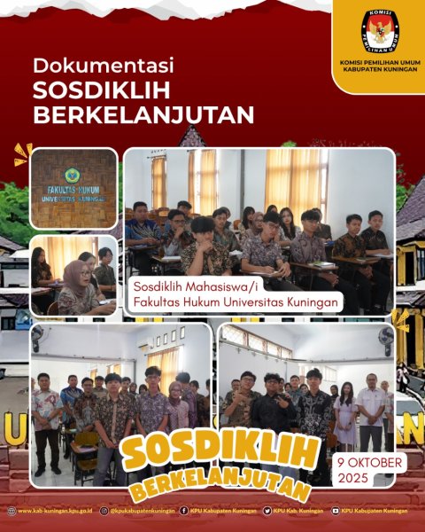 #TemanPemilih, KPU Kabupaten Kuningan telah melaksanakan Sosialisasi Pendidikan Pemilih Berkelanjutan dengan segmen Pemilih Pemula di Fakultas Hukum Universitas Kuningan, 9 Oktober 2025.