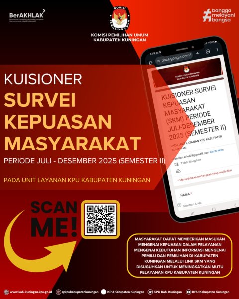 #TemanPemilih, berikut kami sajikan informasi kuisioner Survei Kepuasan Masyarakat (SKM) Periode Juli - Desember 2025 (Semester II) pada Unit Pelayanan KPU Kabupaten Kuningan. . . #KPUMelayani