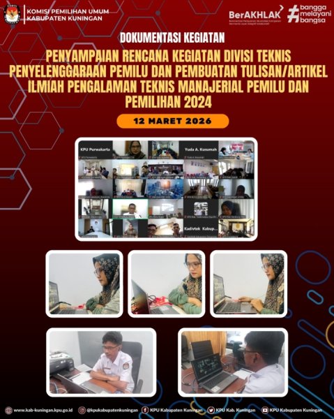 KPU Kabupaten Kuningan mengikuti Kegiatan Penyampaian Rencana Kegiatan Divisi Teknis Penyelenggaraan Pemilu dan Pembuatan Tulisan/Artikel Ilmiah Pengalaman Teknis Manajerial Pemilu dan Pemilihan 2024 secara daring (zoom meeting), pada Hari Kamis (12/3/2026).