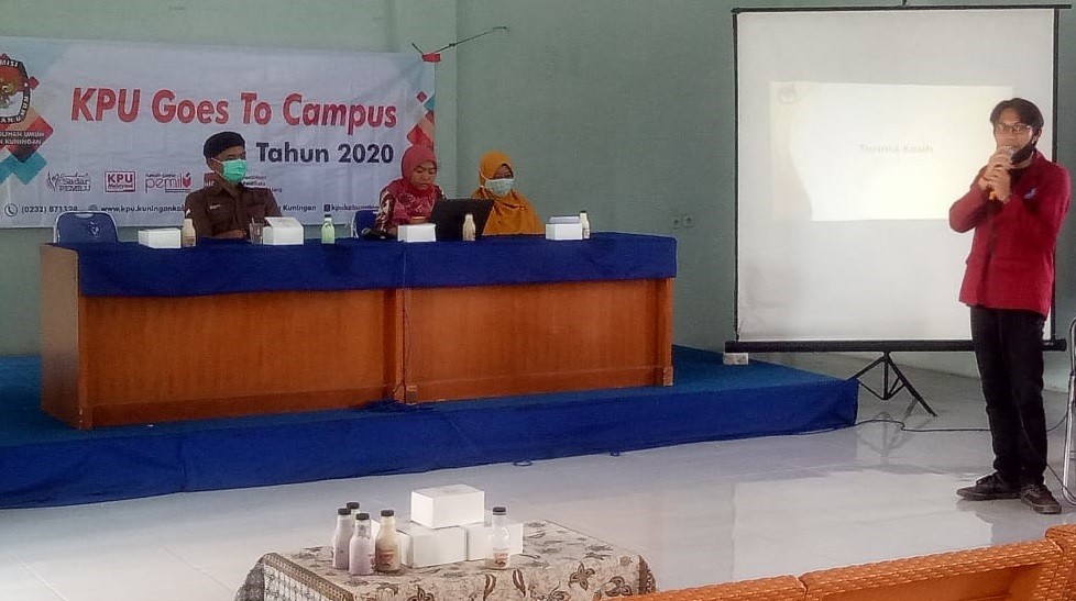 Pada tanggal 03 Desember 2020 Komisi Pemilihan Umum (KPU) Kabupaten Kuningan menyelenggarakan kegiatan pendidikan pemilih dalam rangkaian agenda KPU Goes To Campus dalam bentuk seminar secara tatap muka dengan tetap menggunakan protokol kesehatan seperti jaga jarak dan menggunakan masker dalam rangka pencegahan penyebaran corona virus desease-19 yang sasarannya adalah kalangan milenial di aula kampus STIKes Muhammadiyah Kuningan (lantai 3) yang beralamat di Jl. Raya Pangeran Adipati No. D4 RT 09 RW 03 Kelurahan Cipari Kecamatan Cigugur Kabupaten Kuningan. Kegiatan ini bekerjasama dengan STIKes Muhammadiyah Kuningan yang merupakan tindaklanjut dari MoU antara KPU Kabupaten Kuningan dengan STIKes Muhammadiyah Kuningan beberapa waktu lalu.