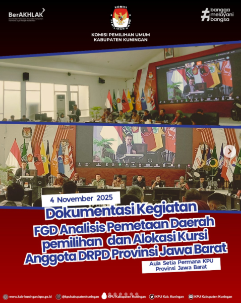 #TemanPemilih, KPU Kabupaten Kuningan telah mengikuti Kegiatan Focus Group Discussion (FGD) Analisis Pemetaan Daerah Pemilihan dan Alokasi Kursi Anggota Dewan Perwakilan Rakyat Daerah (DPRD) Provinsi Jawa Barat, bertempat di Aula Setia Permana, Hari Selasa (4/11/2025).