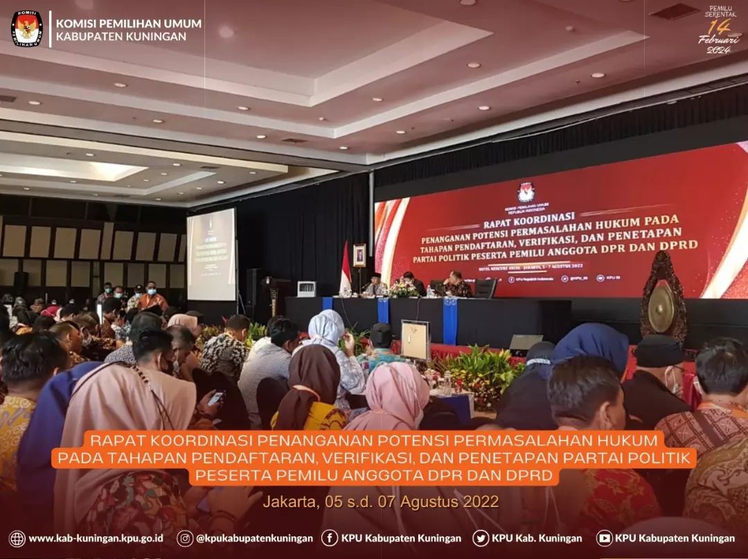 KPU Kabupaten Kuningan – Dari mulai hari Jumat hingga Minggu tanggal 05 – 07 Agustus 2022 bertempat di Mercure Convention Ancol Hotel, Komisi Pemilihan Umum (KPU) Kabupaten Kuningan dalam hal ini Divisi Hukum dan Pengawasan Lestari Widyastuti dan Kepala Sub Bagian Hukum Erik Hamdani mengikuti kegiatan rapat koordinasi penanganan potensi permasalahan hukum pada tahapan pendaftaran, verifikasi dan penetapan Partai Politik Peserta Pemilu Anggota DPR dan DPRD yang diselenggarakan oleh Komisi Pemilihan Umum Republik Indonesia.