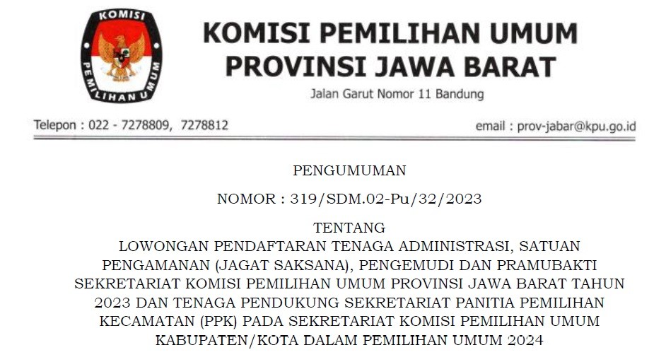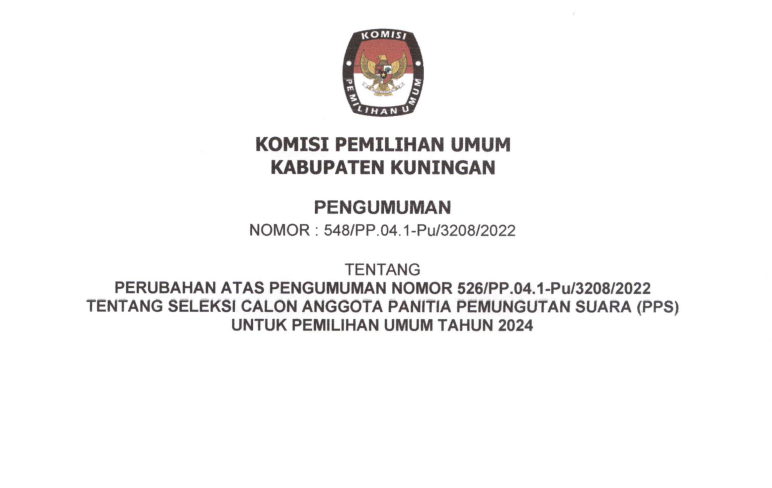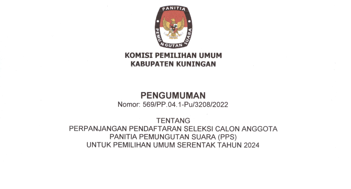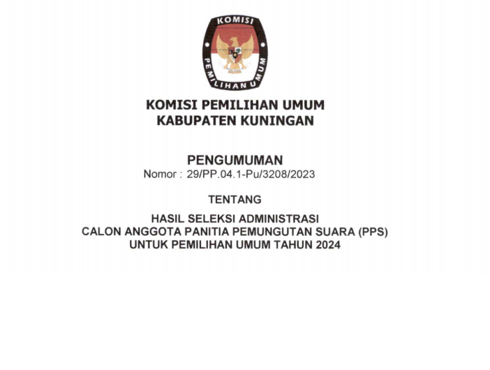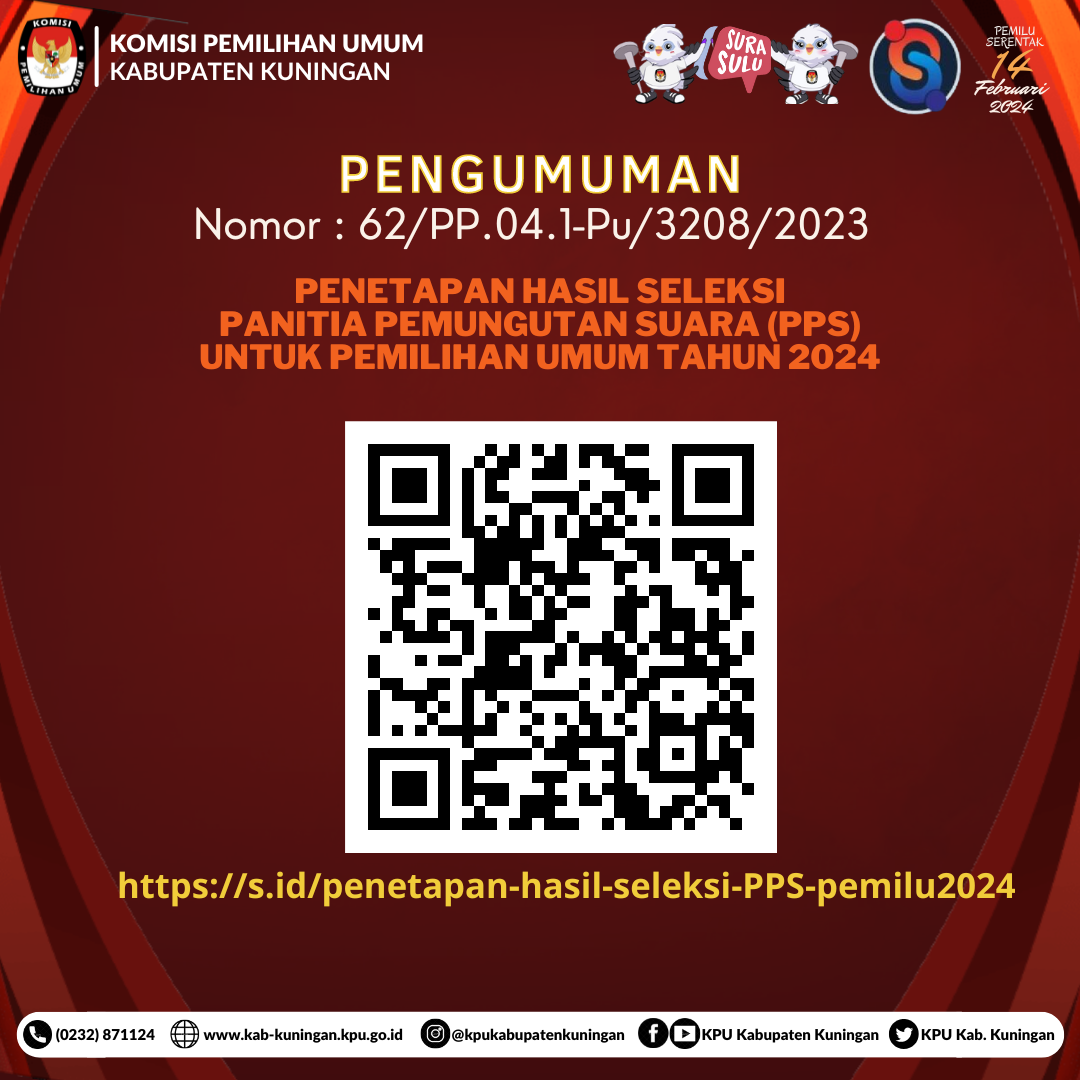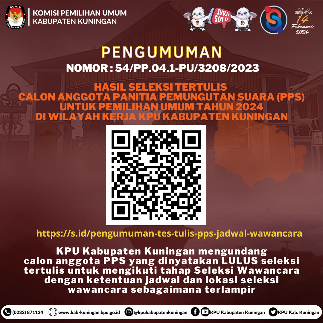 Berdasarkan Berita Acara Rapat Pleno KPU Kabupaten Kuningan Nomor 53/PP.04.1-BA/4/2023 tanggal 21 Januari 2023 tentang Penetapan Hasil Tes Wawancara Calon Anggota Panitia Pemungutan Suara (PPS) untuk Pemilihan Umum Tahun 2024 di Wilayah Kerja Kabupaten Kuningan. KPU Kabupaten Kuningan menetapkan calon anggota PPS Peringkat 1 - 3 ditetapkan sebagai calon anggota PPS TERPILIH dan calon anggota PPS Peringkat 4 - 6 sebagai calon PENGGANTI ANTAR WAKTU (PAW). Daftar nama calon anggota PPS Terpilih dan calon anggota PPS Pengganti Antar Waktu (PAW), sebagaimana data terlampir. Sehubungan dengan hal tersebut di atas, KPU Kabupaten Kuningan mengundang calon anggota PPS Terpilih untuk hadir dalam acara Pelantikan, Pengambilan Sumpah/Janji, dan Penandatanganan Pakta Integritas, pada: Hari / Tanggal : Selasa, 24 Januari 2023 Waktu : Pukul 09.00 WIB s.d. selesai Tempat : Menunggu konfirmasi Dresscode : - Celana hitam, kemeja putih, peci hitam, sepatu hitam (laki-laki) - Rok hitam, kemeja putih, sepatu hitam (perempuan) Untuk membaca secara lengkap, klik Link download : https://s.id/penetapan-hasil-seleksi-PPS-pemilu2024