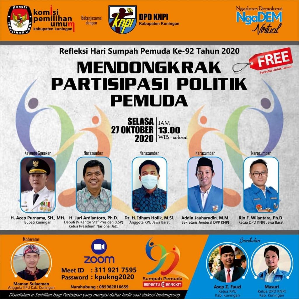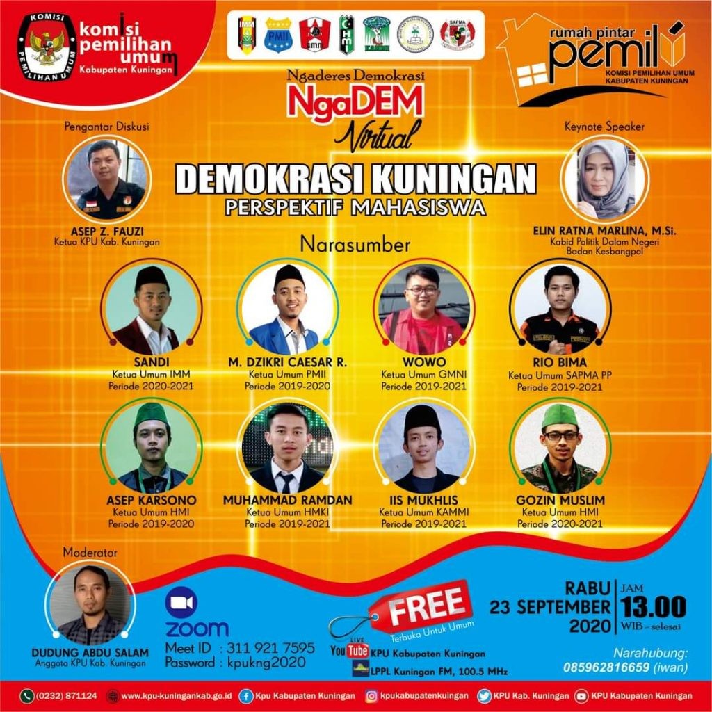 NgaDEM (Ngaderes Demokrasi) Virtual KPU Kabupaten Kuningan Tema: “Demokrasi Kuningan Perspektif Mahasiswa” Keynote Speaker: Elin Ratna Marlina, M.Si. (Kabid Politik Dalam Negeri Badan Kesbangpol) Narasumber: Sandi (Ketua Umum IMM – Periode 2020-2021) M. Dzikri Caesar R. (Ketua Umum PMII – Periode 2019-2020) Wowo (Ketua Umum GMNI – Periode 2019-2021) Rio Bima (Ketua Umum SAPMA PP – Periode 2019-2021) Asep Karsono (Ketua Umum HMI – Periode 2019-2020) Muhammad Ramdan (Ketua Umum HMKI – Periode 2019-2021) Iis Mukhlis (Ketua Umum KAMMI – Periode 2019-2021) Gozin Muslim (Ketua Umum HMI – Periode 2020-2021) Pengantar Diskusi: Asep Z. Fauzi (Ketua KPU Kab. Kuningan) Moderator: Dudung Abdu Salam (Anggota KPU Kab. Kuningan) Waktu: Hari RABU Tanggal 23 September 2020 Pukul 13.00 s.d. 15.00 WIB ZOOM Meeting Meeting ID: 311 921 7595 Password: kpukng2020 Link : https://s.id/NgaDEM16092020 Daftar Peserta : https://s.id/daftarpesertaNgaDEM16092020