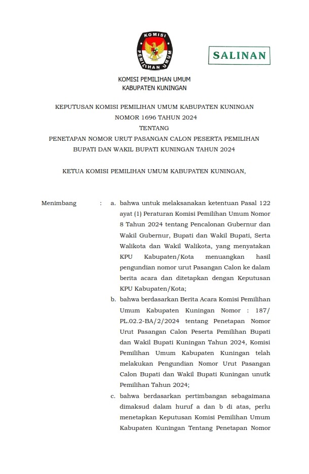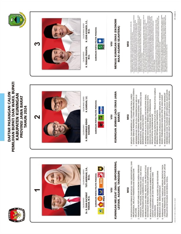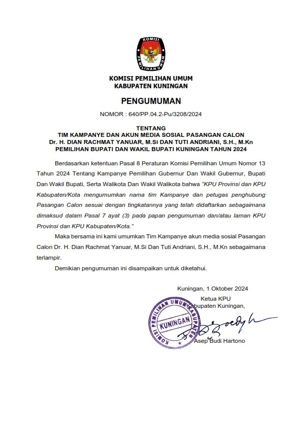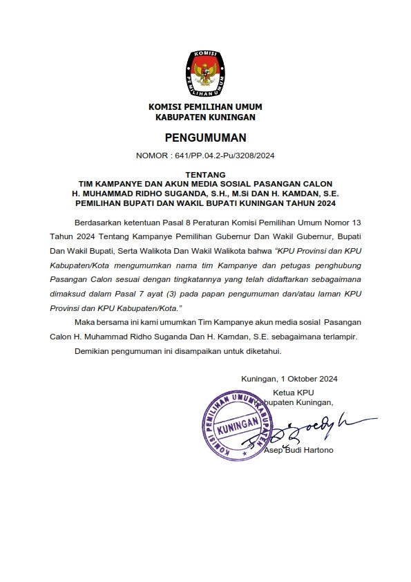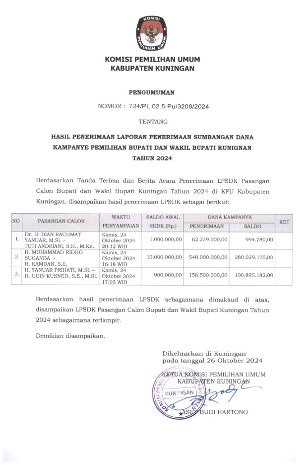 Berdasarkan Tanda Terima dan Berita Acara Penerimaan LPSDK Pasangan Calon Bupati dan Wakil Bupati Kuningan Tahun 2024 di KPU Kabupaten Kuningan, disampaikan hasil penerimaan LPSDK sebagai berikut .....