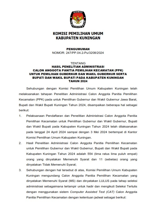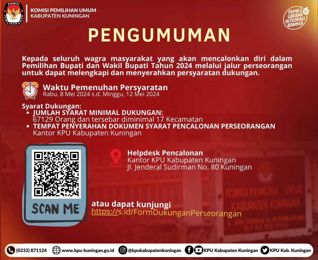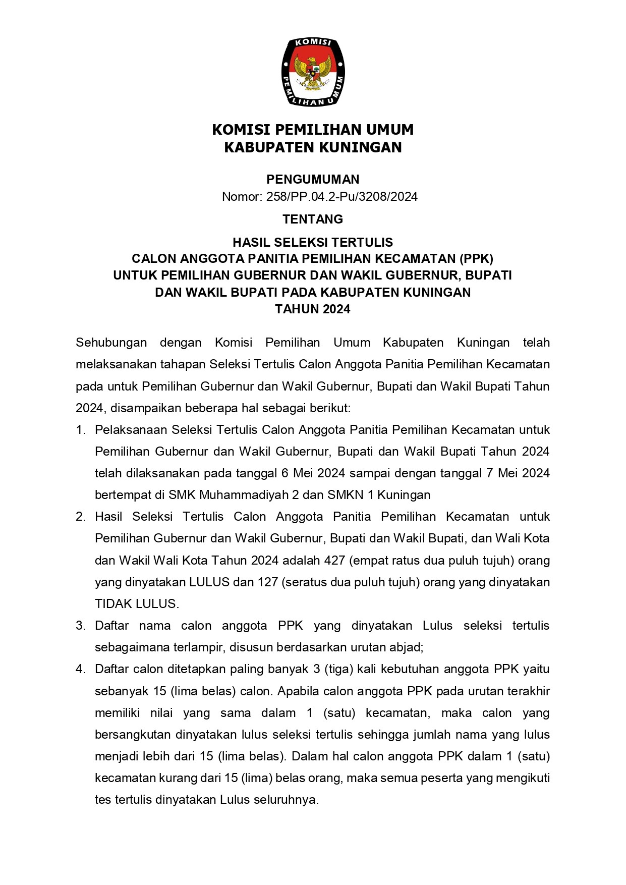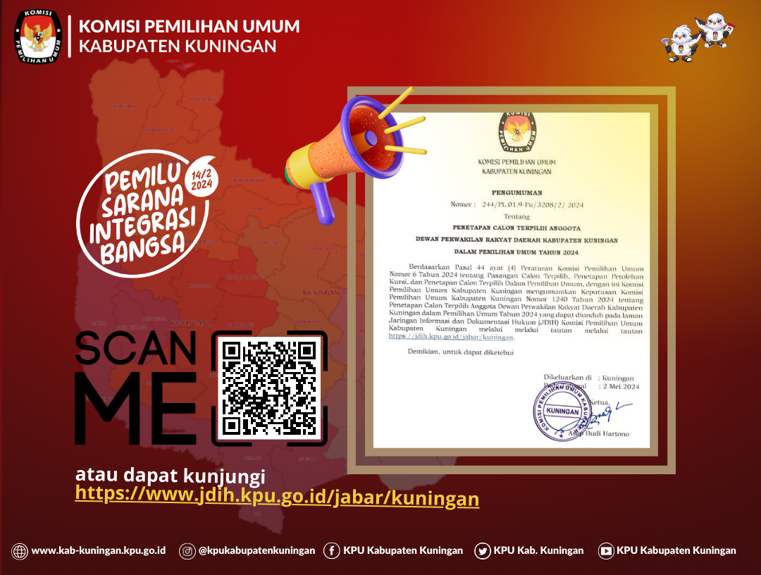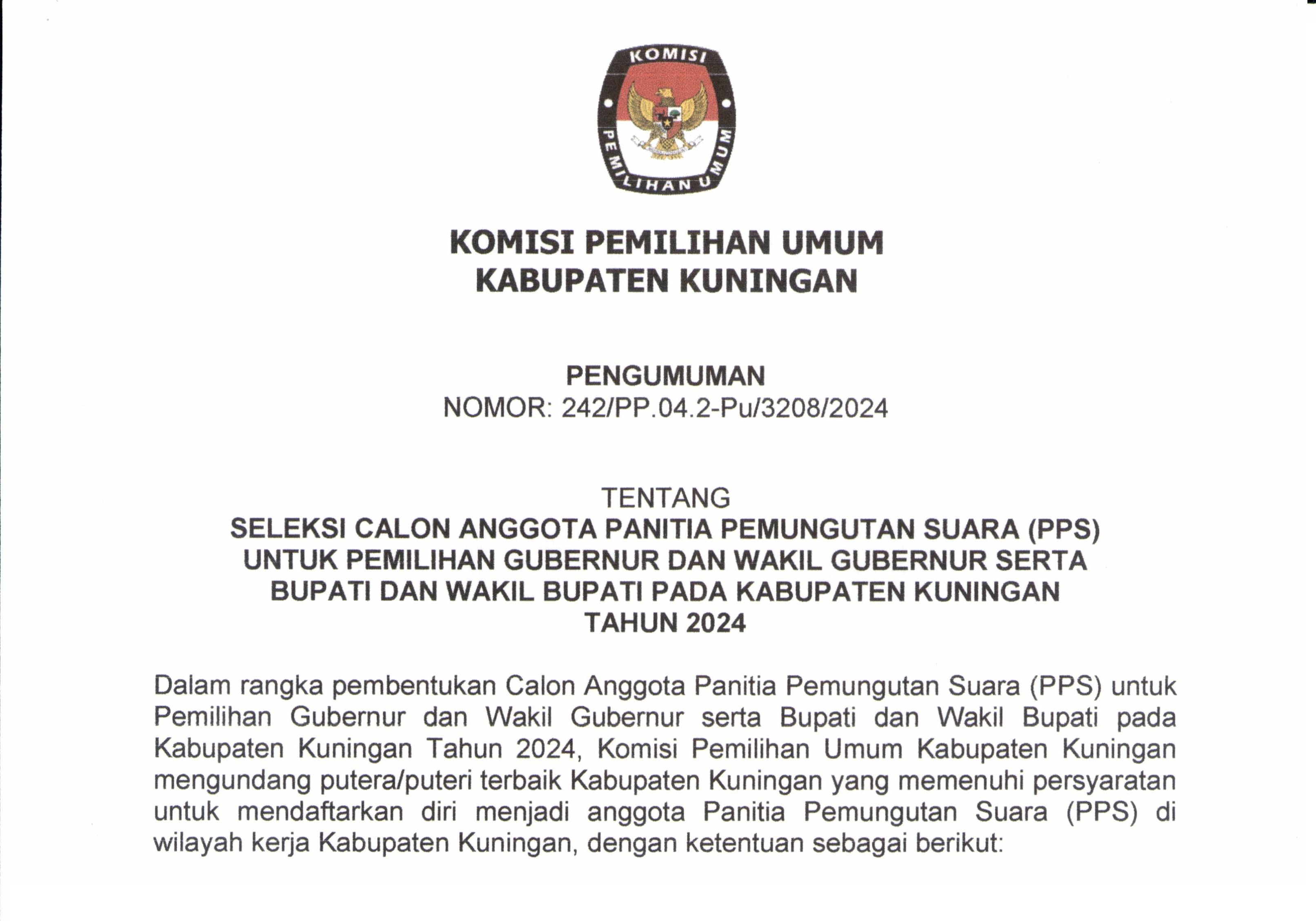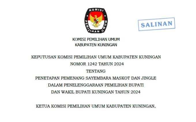 Bahwa berdasarkan Peraturan Komisi Pemilihan Umum Nomor 2 Tahun 2024 tentang Tahapan dan Jadwal Pemilihan Gubernur dan Wakil Gubernur, Bupati dan Wakil Bupati, serta Walikota dan Wakil Walikota Tahun 2024; Berdasarkan ketentuan pasal 13 ayat (1) huruf g dan ayat (8) huruf f peraturan Komisi Pemilihan Umum Nomor 9 Tahun 2022 tentang Partisipasi Masyarakat Dalam Pemilihan Umum dan Pemilihan Gubernur dan Wakil Gubernur, Bupati dan Wakil Bupati, dan/atau Walikota dan Wakil Walikota, yang menyatakan bahwa metode sosialisasi secara tidak langsung dapat dilakukan melalui penyebaran bahan atau barang sosialisasi yang salah satunya yaitu bahan atau barang lainnya; Berdasarkan pertimbangan sebagaimana dimaksud b, serta untuk mendukung kegiatan sosialisasi kepemiluan dan sebagai simbol identitas Komisi Pemilihan Umum Kabupaten Kuningan dalam melayani masyarakat menggunakan hak pilihnya, perlu menetapkan Pemenang Sayembara Pembuatan Maskot dan Jingle Pemilihan Bupati dan Wakil Bupati kabupaten Kuningan Tahun 2024; Bahwa berdasarkan pertimbangan sebagaimana dimaksud dalam ..... Selengkapnya dapat diunduh dilink berikut