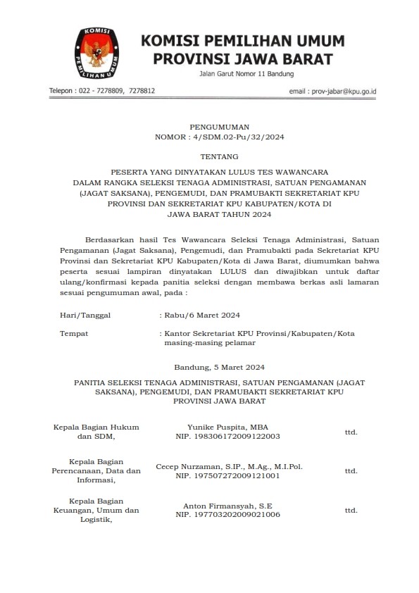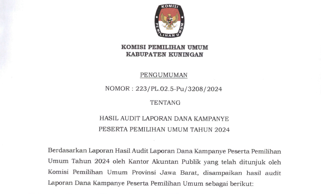 Berdasarkan Laporan Hasil Audit Laporan Dana Kampanye Peserta Pemilihan Umum Tahun 2024 oleh Kantor Akuntan Publik yang telah ditunjuk oleh Komisi Pemilihan Umum Provinsi Jawa Barat, disampaikan Laporan Asuransi Independen, Formulir Laporan Penerimaan dan Pengeluaran Dana Kampanye, dan Formulir Asersi atas Laporan Penerimaan dan Pengeluaran Dana Kampanye sebagaimana terlampir dalam tautan di bawah ini.